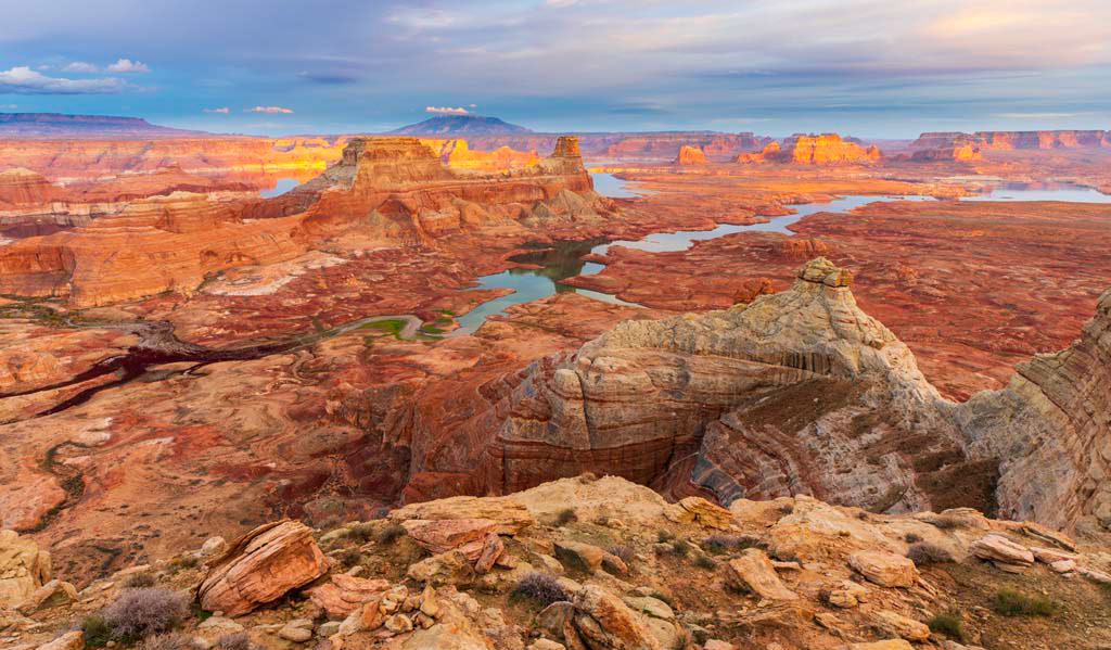 Sunset view at Alstrom Point. The formation in the middle is called Gunsight Butte.